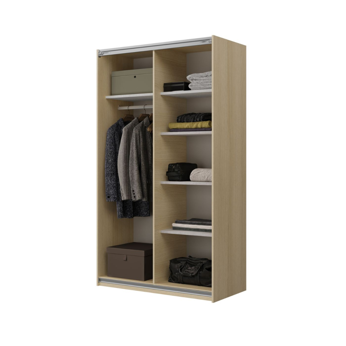 Interiér skrine je prakticky rozdelený na šatníkovú časť s tyčou na vešanie oblečenia a policovú časť, ktorá ponúka dostatok miesta na uloženie oblečenia, textílií či doplnkov. Viaceré police pomáhajú udržať prehľad a poriadok, takže každá vec má svoje miesto. Vďaka tomu je každodenné používanie skrine pohodlné a organizácia oblečenia jednoduchšia.
