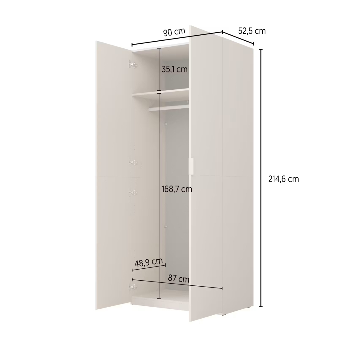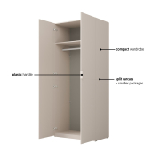 V hornej časti skrine sa nachádza polica, pod ňou je vešiaková tyč ideálna na košele, kabáty alebo šaty. Do spodnej časti je možné dokúpiť ďalšiu policu (odtieň v dekore linen) a zväčšiť tak úložný priestor podľa potreby. Skriňa je vybavená praktickými plastovými úchytkami, ktoré uľahčujú otváranie dverí.