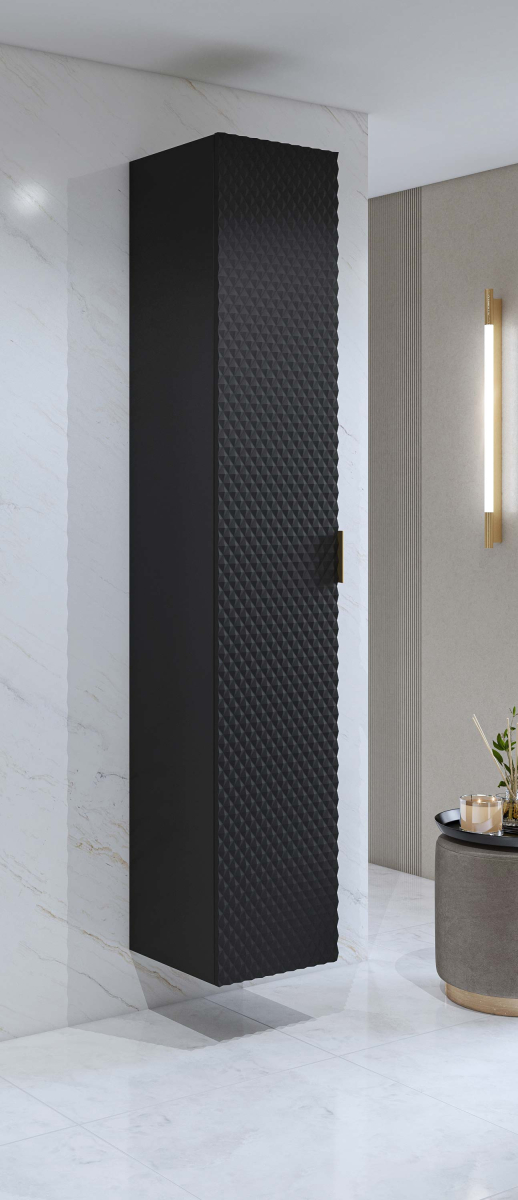 Kúpeľňový nábytok LAURA čierna - vysoká skrinka do kúpeľne LAURA čierna 30W3NM17, moderný sektorový nábytok do kúpeľne vyrobený vo výbornej kvalite prevedenia, farebné prevedenie čierna matná/čierna matná pyramídky. Materiál použitý na výrobu korpus - certifikovaná laminovaná drevotrieska v hrúbke 15 mm, hrany ohranené ABS páskou, dvierka - fólia na MDF v hrúbke 18 mm - profil dvierok v tvare malých pyramíd. Úchytka je kovová v zlatej farbe, zatváranie dvierok a šuflíkov pomocou systému pomalého zatvárania.
