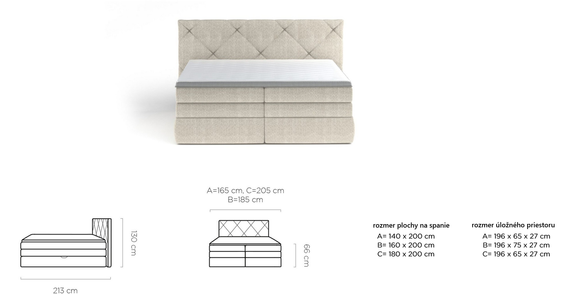 - rozmer lôžka 140x200cm, výška čela 130 x šírka 165 x dĺžka 213 cm
