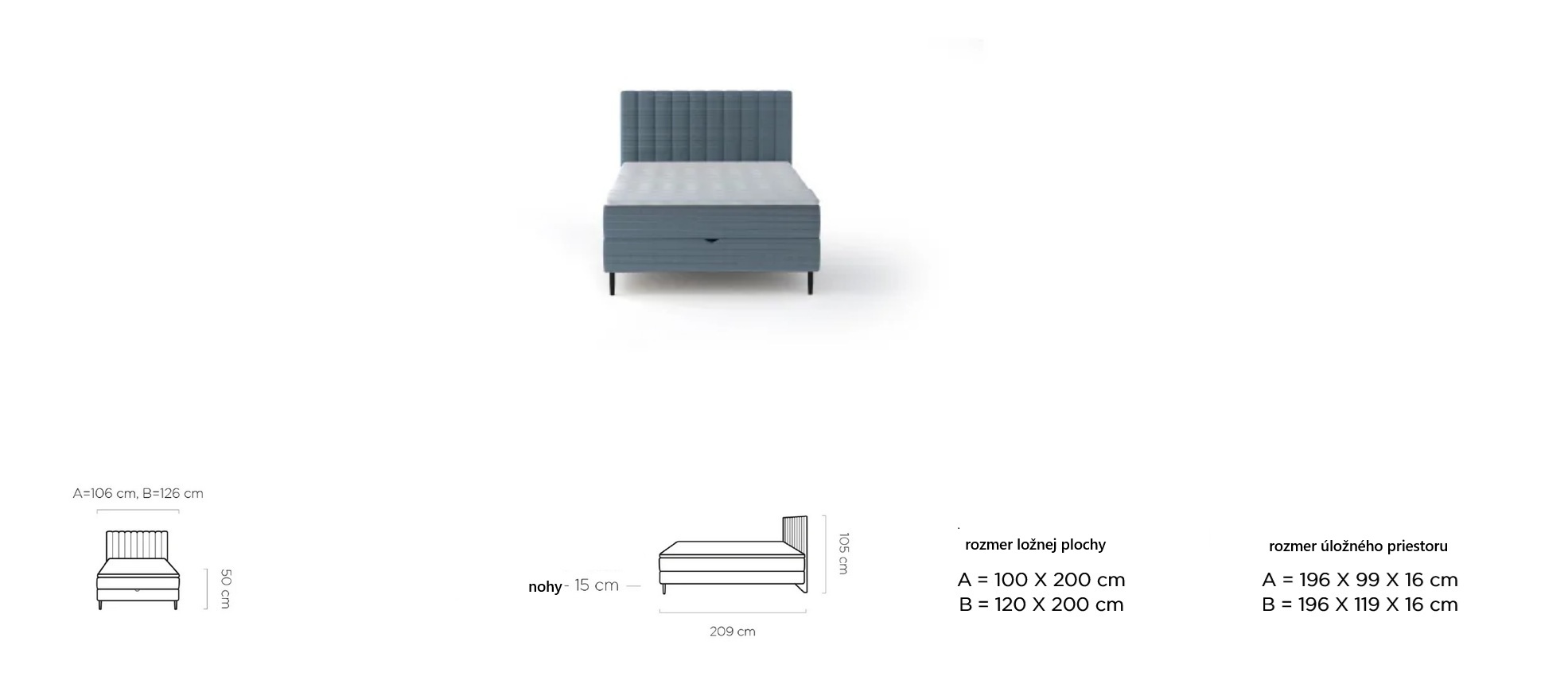 Praktický výklopný mechanizmus s pružinovým systémom umožňuje jednoduchý prístup k priestrannému úložnému priestoru bez námahy. Luxusný vzhľad postele dotvárajú vysoké čierne nožičky, ktoré zároveň uľahčujú upratovanie pod posteľou.