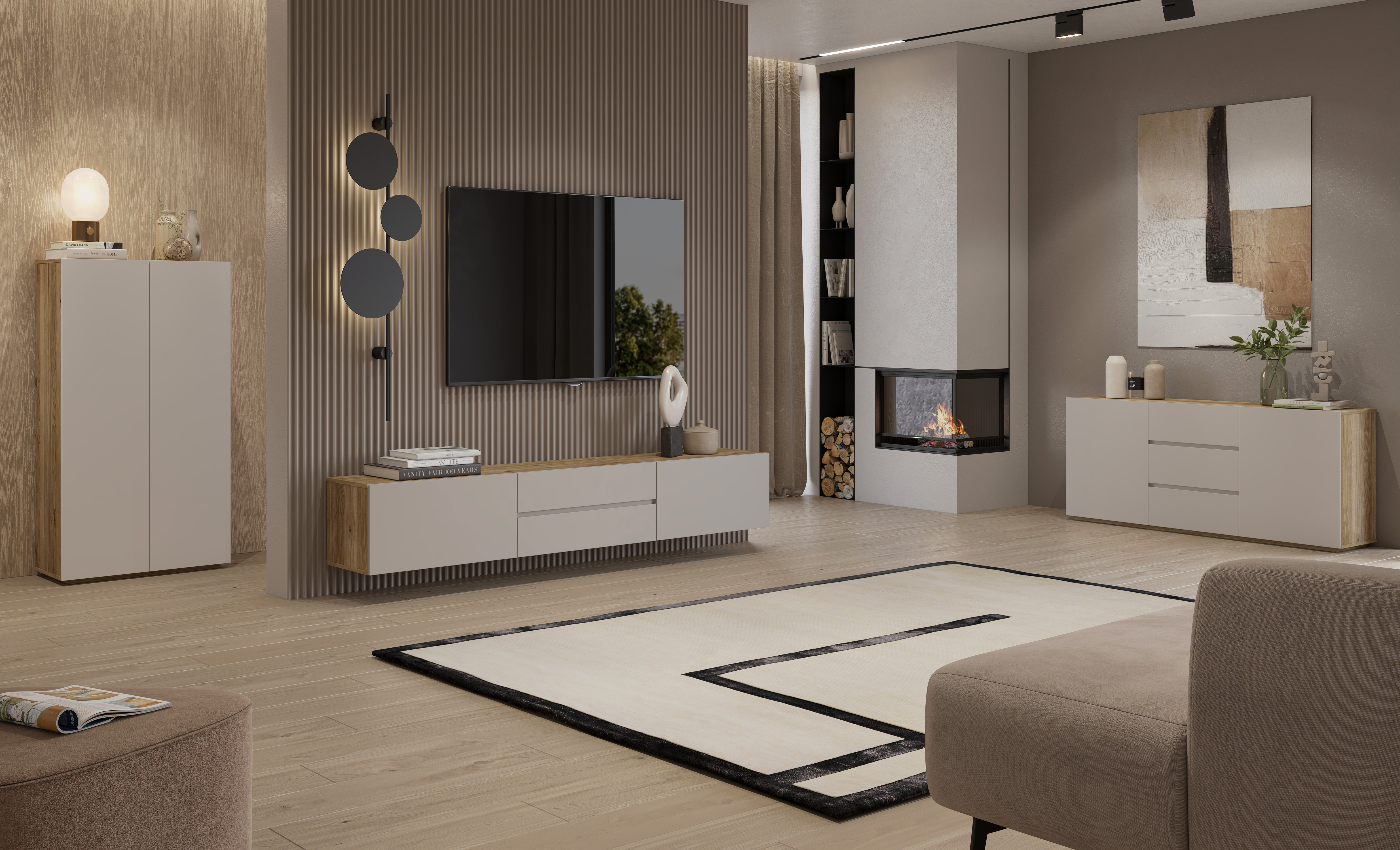 Kolekcia CRISS spája moderný dizajn a praktickosť v elegantných, módnych odtieňoch dub Mauvella / kašmír. Kašmír je jemný odtieň medzi béžovou a sivou s teplým podtónom, ktorý v interiéri vytvára pokojnú, útulnú a nadčasovú atmosféru. Bezúchytkový systém podporuje jednoduchosť a elegantnú geometriu, ktorá sa perfektne hodí do minimalistických alebo moderných interiérov, pričom charakteristický skosený horný okraj dodáva nábytku čistý, minimalistický vzhľad.