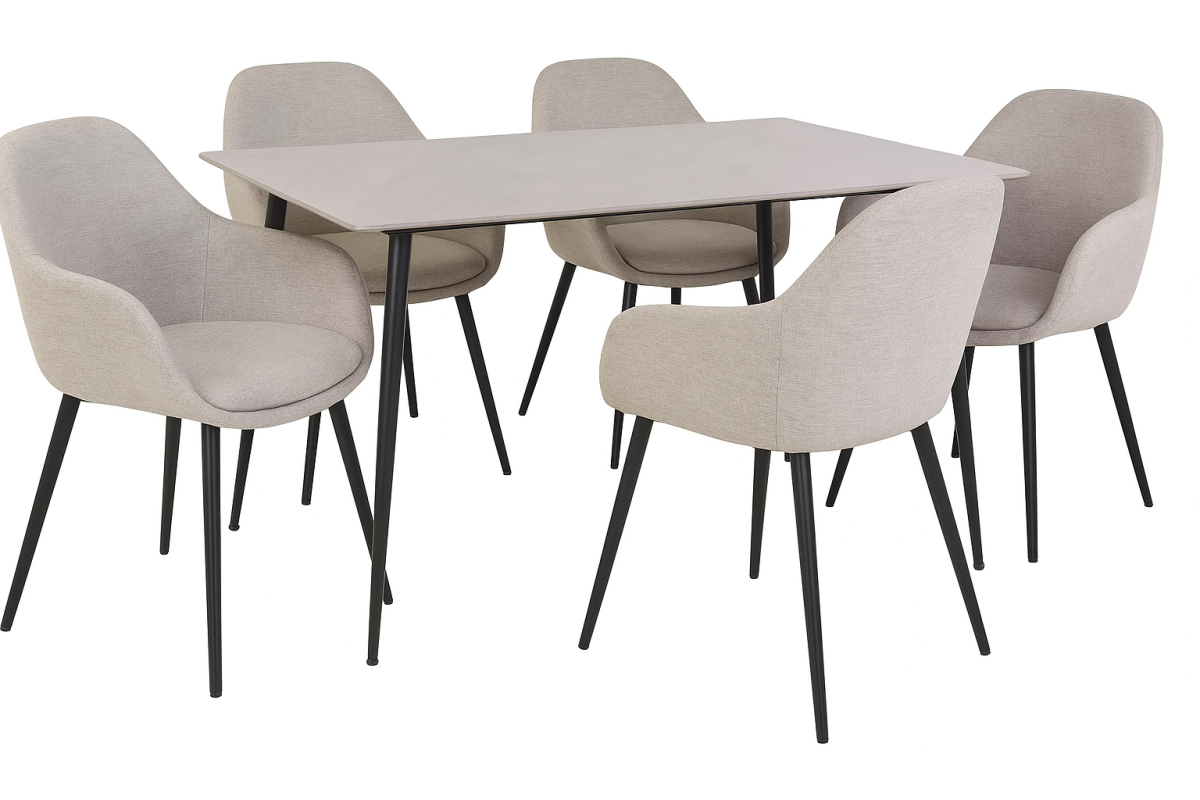 Štýlový a praktický set, ktorý dodá vašej jedálni moderný charakter. Spojenie odolného stola Rion 160 s keramickou doskou a štyroch pohodlných stoličiek Vinto v svetlobéžovej látke Brego 31 prináša eleganciu aj komfort.