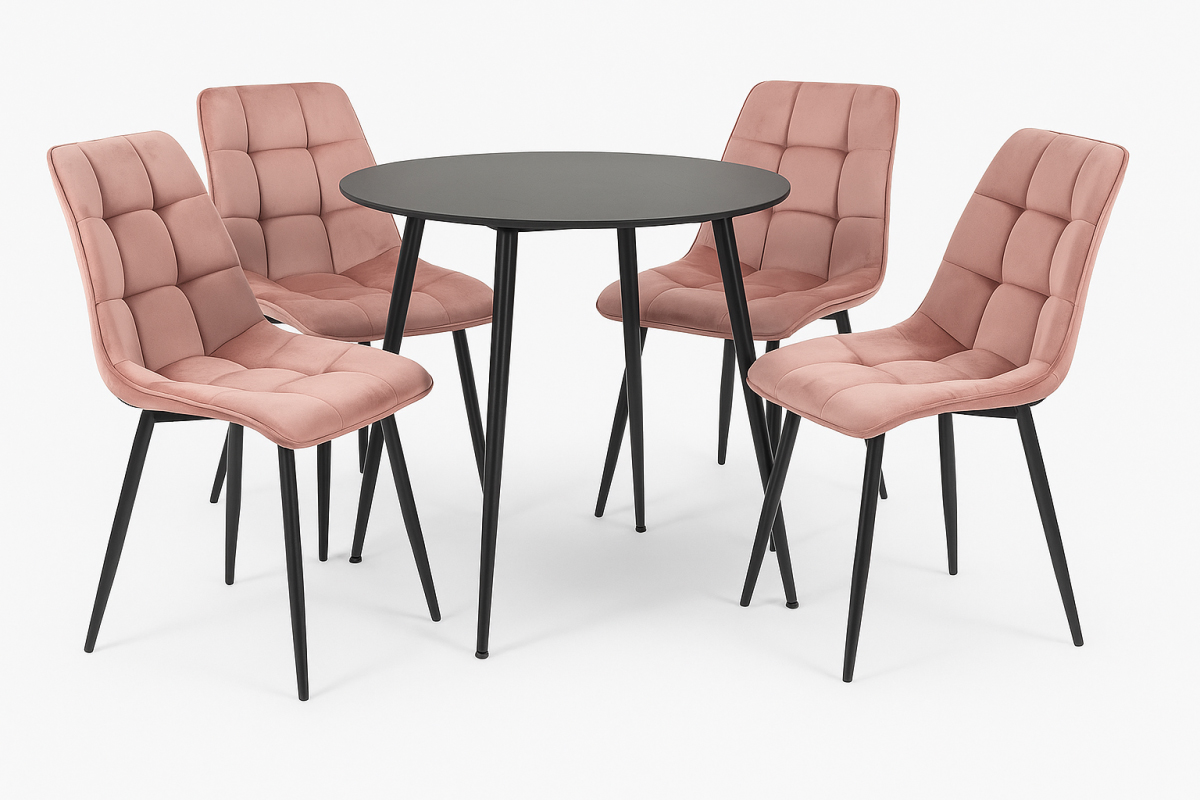 Moderný jedálenský set Rion Ø90 so štyrmi stoličkami Chic v látke Bluvel 52 (antická ružová) je ideálnym riešením pre menšie jedálne či kuchyne. Kombinácia elegantného okrúhleho stola s čiernym keramickým plátom s kresbou imitácie kameňa a pohodlných čalúnených stoličiek v jemnom ružovom odtieni pôsobí luxusne a moderne.