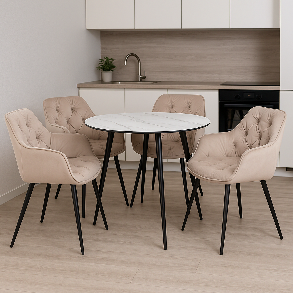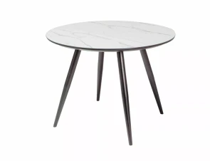 Jedálenský stôl so štyrmi kovovými nohami a okrúhlym plátom z keramiky