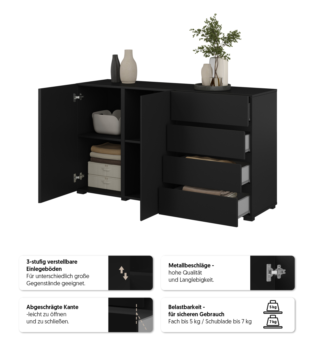 Premeňte svoju obývačku na galériu moderného dizajnu. Dizajn, ktorý definuje priestor. Sektorový nábytok ASYMETRIC - komoda 2D4S, č.42 od renomovaného výrobcu IMS Helvetia predstavuje dokonalú symbiózu čistých línií, funkčnosti a odvážneho matného dizajnu. Tento systém je navrhnutý pre tých, ktorí hľadajú výnimočnosť a chcú vystúpiť z radu konvenčného nábytku. Kolekcia ASYMETRIC sa vyznačuje bezúchytkovým systémom a unikátnym členením frontov, ktoré vytvára dynamický, asymetrický vizuál. Korpusy aj dvierka sú vyrobené z certifikovanej, laminovanej drevotriesky odolnej voči poškriabaniu, ohranené ABS páskou na predĺženie životnosti.
