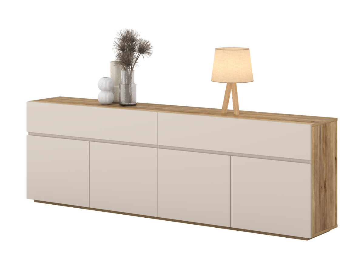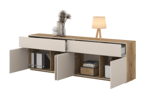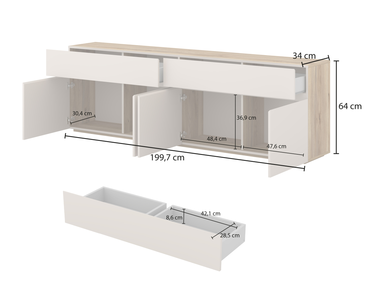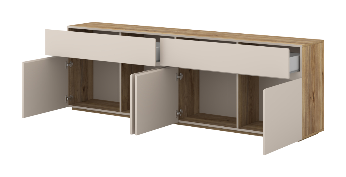Komoda s rozmermi šírka 200 cm, výška 64 cm, hĺbka 34 cm ponúka praktické usporiadanie – dve horné zásuvky a štyri dvierka v spodnej časti, ktoré vytvárajú dve samostatné skrinky vertikálne predelené bez vnútornej police. Nábytok je postavený na pevnom sokli s hrúbkou 22 mm, čo zaručuje stabilitu a elegantný vzhľad.