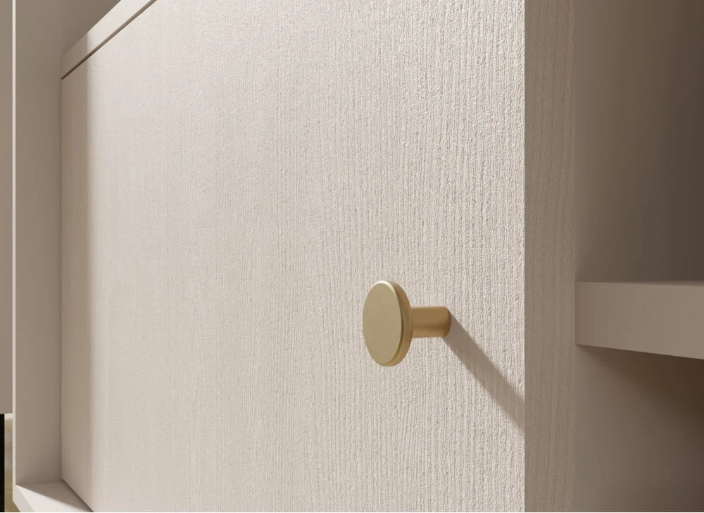 Komoda je vyrobená z kvalitnej laminovanej DTD, doplnená kovovými nohami a kovovými úchytkami, ktoré pridávajú nábytku ľahkosť, stabilitu a jemný luxusný akcent. Piesková farba korpusu, zlaté úchytky a čierne kovové nohy vytvárajú harmonický celok, vhodný do svetlého, vzdušného a útulného priestoru.