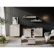 Komoda GRANDE spája praktickosť, nadčasový dizajn a útulnú eleganciu. Na ľavej strane sa nachádza dvojdverová skrinka, uprostred sú dve poličky v otvorenej nike, ideálne na multimediálne zariadenia alebo dekorácie, a pravá strana ponúka tri zásuvky pre dostatok úložného priestoru na dokumenty, diaľkové ovládače či menšie doplnky.