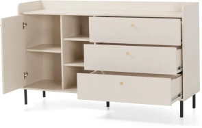 Vyrobená je z kvalitnej laminovanej drevotrieskovej dosky (DTD) a doplnená o kovové nohy a kovové úchytky, ktoré jej dodávajú ľahkosť, stabilitu a moderný vzhľad. Piesková farba korpusu v kombinácii so zlatými úchytkami a čiernymi kovovými nohami vytvára jemný, no výrazný kontrast, ktorý pôsobí elegantne a harmonicky. Komoda tak prirodzene zapadne do svetlého, vzdušného a útulného interiéru.