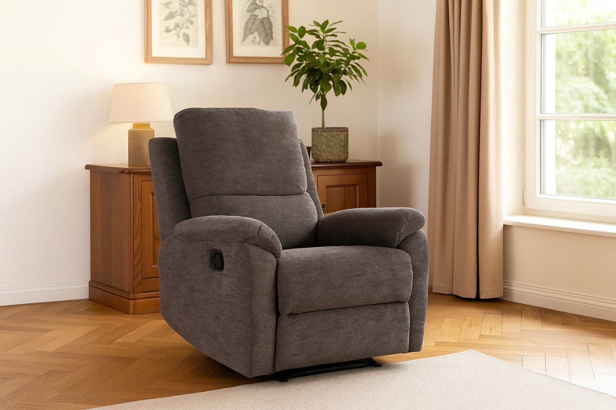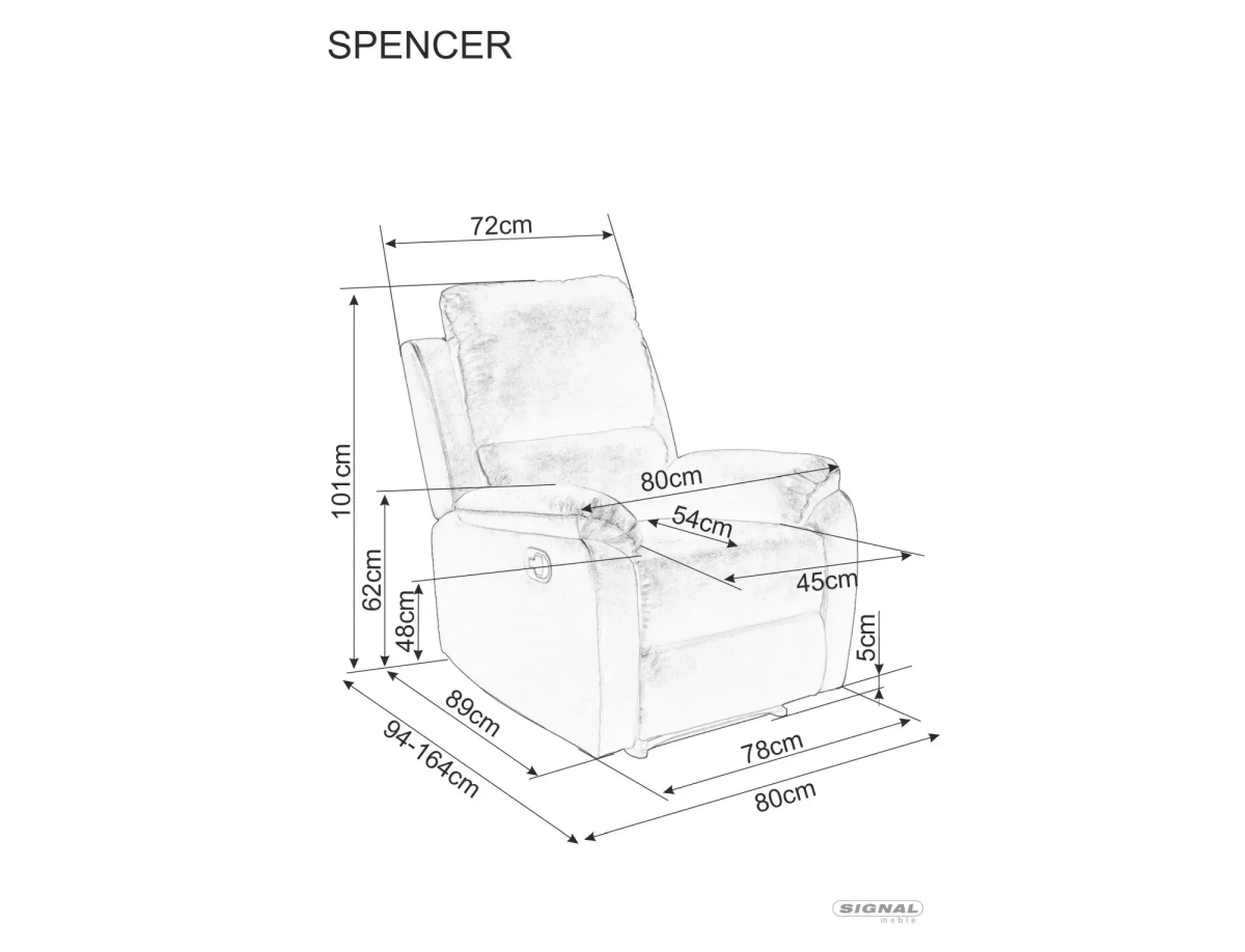 Kreslo SPENCER 1 Raven poskytuje pohodlný relax vďaka možnosti manuálneho nastavenia polohy operadla a podnožky, čím sa jednoducho prispôsobí individuálnym potrebám používateľa. Polohovanie sa ovláda mechanicky pomocou páčky umiestnenej na boku kresla a nevyžaduje elektrické napájanie. Mechanizmus funguje plynulo a spoľahlivo vďaka pevnej kovovej konštrukcii s dlhou životnosťou.