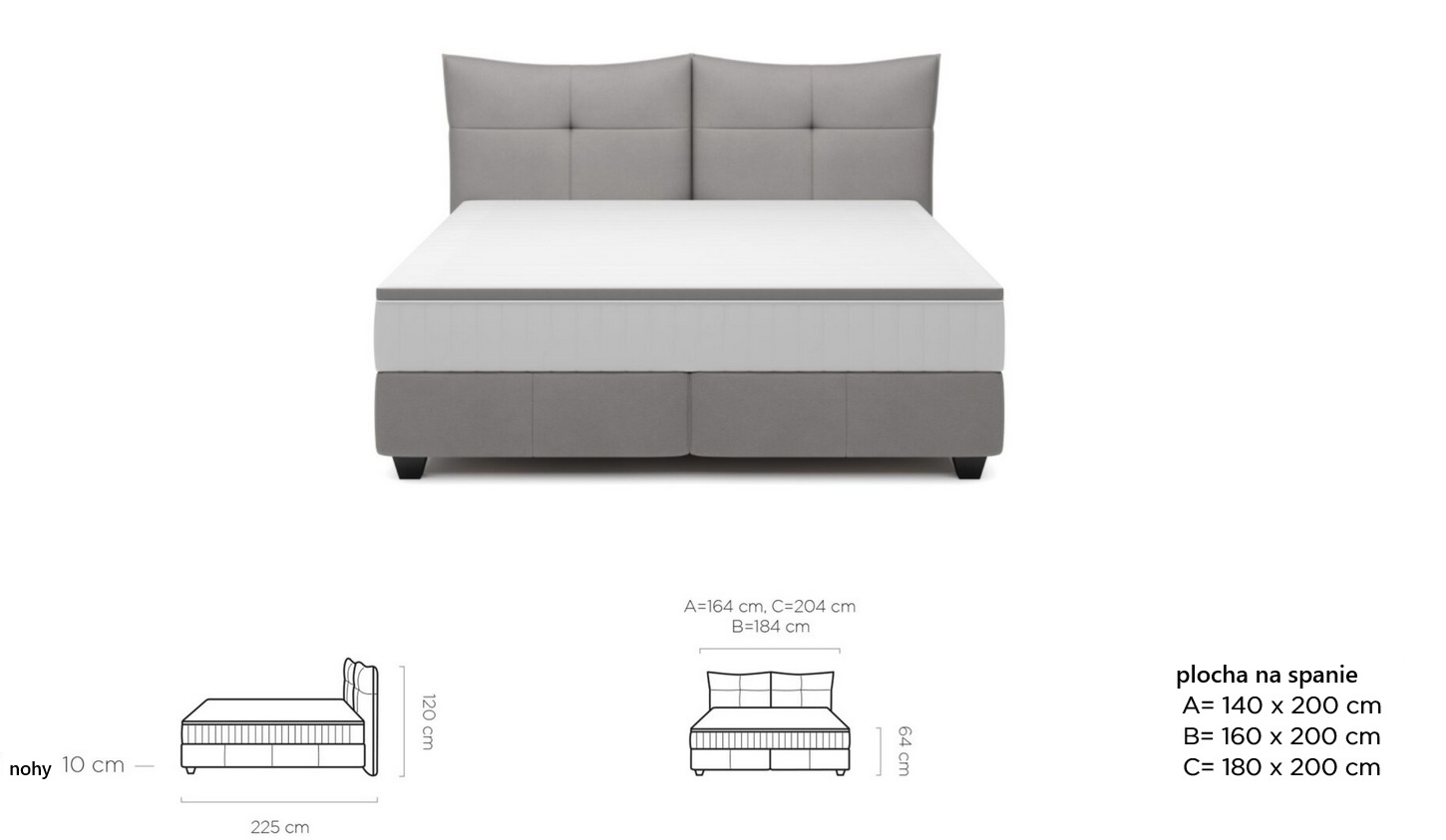 • rozmer lôžka 140x200cm,  výška čela 120 x šírka 164 x dĺžka 225 cm