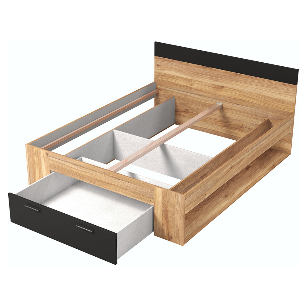 Posteľ disponuje praktickým úložným priestorom v prednej časti, ktorý tvorí výsuvný šuflík – ideálne riešenie pre uloženie posteľnej bielizne, prikrývok či sezónneho oblečenia. Plastové úchytky zabezpečujú jednoduchú manipuláciu a dlhú životnosť.