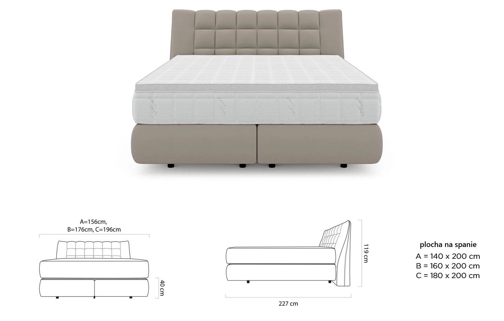 - rozmer lôžka 180x200cm, výška čela 119 x šírka 196 x dĺžka 227 cm