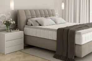 - Elegantný dizajn: Posteľ zaujme svojím moderným tvarom a hlbokým prešívaním, ktoré dodáva štýlový vzhľad a jedinečný charakter