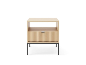 Stolík je vybavený praktickou zásuvkou na uloženie drobných predmetov a otvorenou nikou, ideálnou na knihy alebo dekorácie. Nábytok stojí na čiernych kovových nožičkách, ktoré pridávajú moderný kontrast a opticky odľahčujú stolík. Čierny kovový úchyt ladí s nožičkami a dopĺňa čistý, moderný vzhľad.