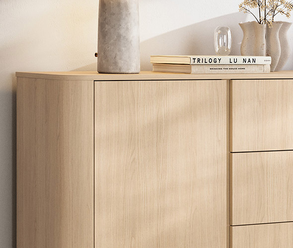 Komoda s tromi zásuvkami a dvoma dvierkami poskytuje dostatok miesta na usporiadanie všetkého potrebného pre vašu obývaciu izbu.