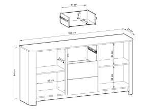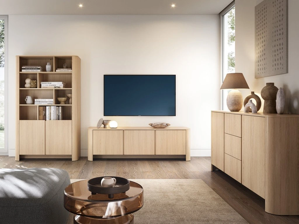 Obývacia stena Bari pozostáva z troch samostatných kusov nábytku: komody, TV stolíka a policového regálu, ktoré spoločne vytvárajú harmonický a funkčný interiér.