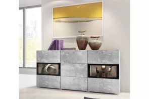 Elegantná obývacia stena BAROS vnesie do vašej obývačky nezvyčajnú atmosféru podčiarknutú štruktúrou betónu. Kresba je výrazná, a už na prvý pohľad upúta na seba pozornosť.