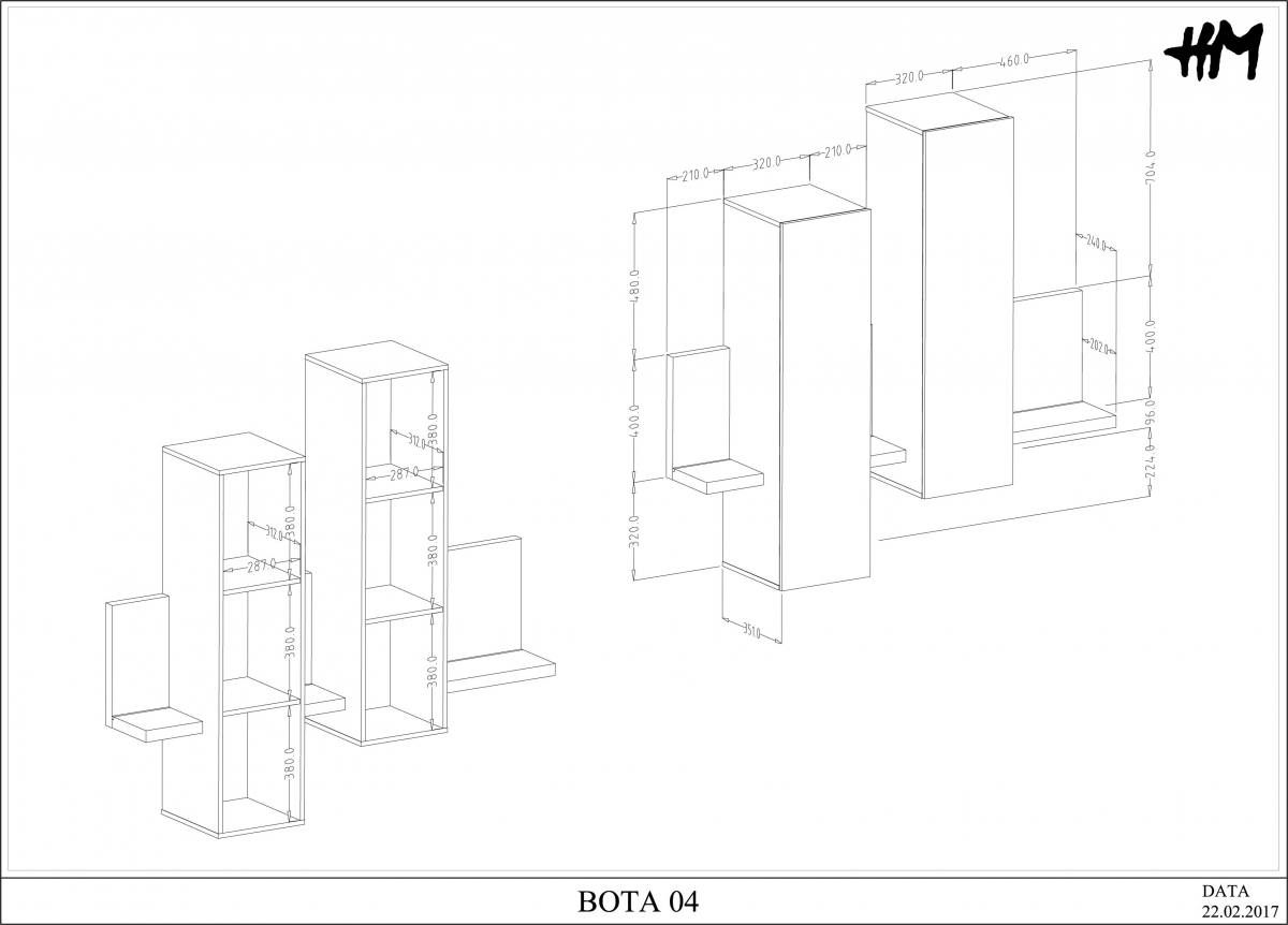 • Asymetrická estetika: Netradičné usporiadanie závesných skriniek a políc rozbíja nudu klasických obývacích stien a ponúka priestor pre vašu kreativitu.
