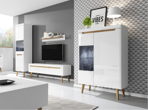 Obývacia stena NORDI, farebné prevedenie dub riviera-biely lesk v sebe spája dva smery - retro štýl šesťdesiatych rokov a sučasný trend bielej vysokej lesklej farby s výfrezom na otváranie. Dizajnéri teda v tomto nábytku stavili na minulosť aj súčasnosť. Len čas ukáže, či to bola správna voľba. LED osvetlenie nie je zarátané v cene.