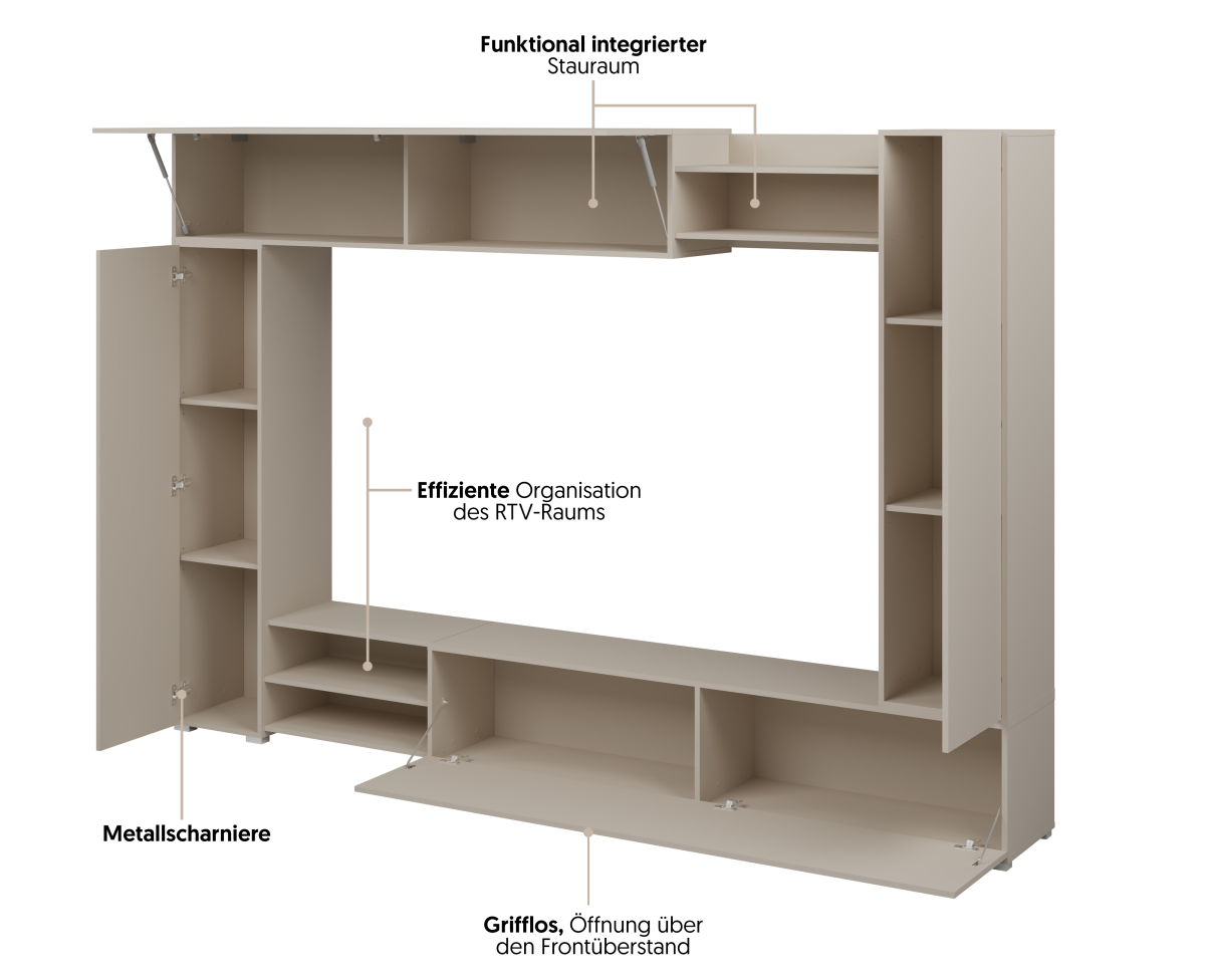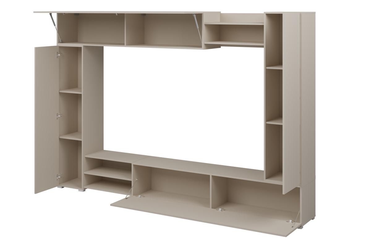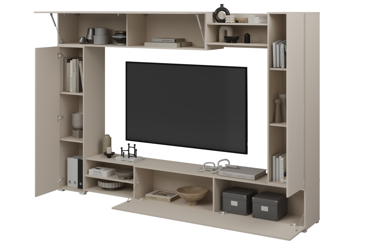 Inteligentné členenie: Kombinácia uzavretých úložných priestorov a otvorených políc na dekorácie, knihy či audio techniku.