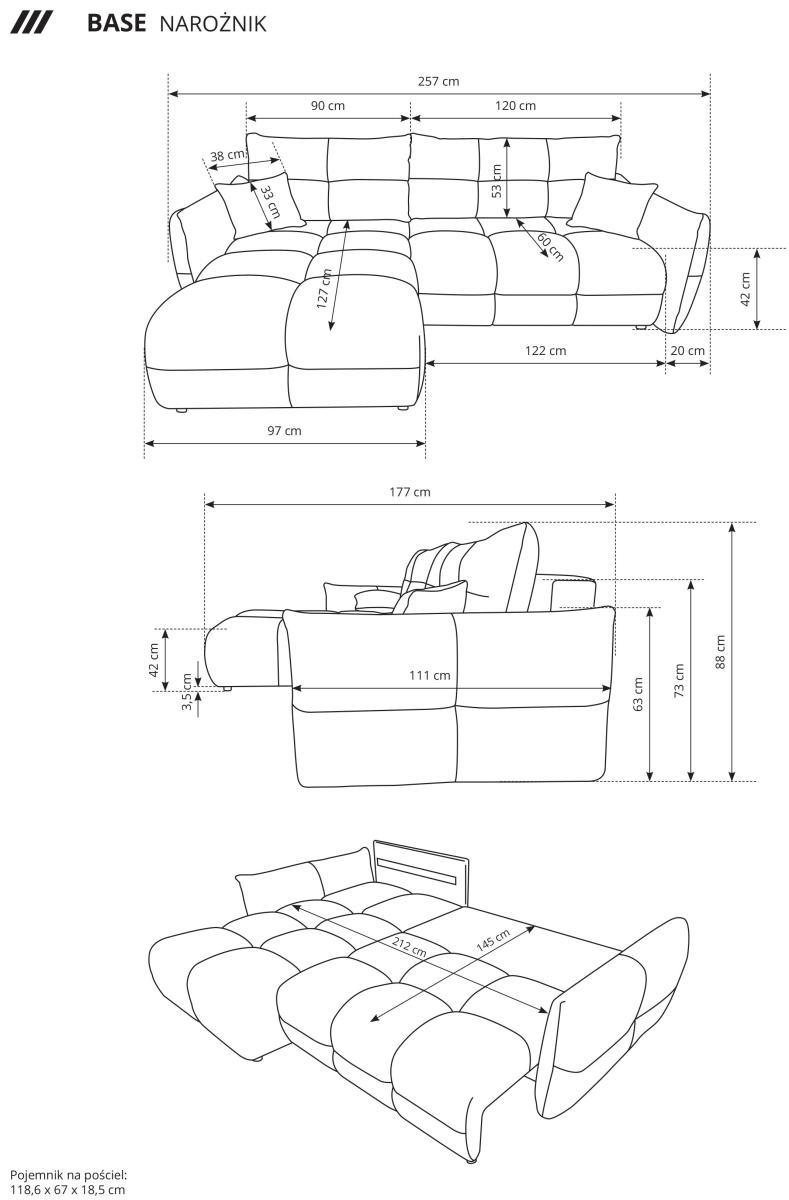 Sedacia súprava BASE zaujme na prvý pohľad svojím nadýchaným, trendovým dizajnom. Je ideálnym riešením pre tých, ktorí hľadajú komfort bez kompromisov a zároveň chcú moderný prvok do svojho interiéru. Rozmerovo prijateľná a kompaktná, BASE je výbornou voľbou aj do bytov a menších priestorov – poskytne dostatok miesta na sedenie bez toho, aby zaberala priveľa miesta. Táto sedačka ponúka praktickú rozkladaciu funkciu – jednoduchým povytiahnutím spodnej časti sedadla vytvoríte komfortné lôžko. Pod touto časťou sa zároveň nachádza úložný priestor, ideálny na periny, deky či iné veci. Čierne nenápadné klzáčiky na spodnej časti navyše chránia podlahu a zároveň zabezpečujú stabilitu, bez rušivého zásahu do celkového dizajnu.