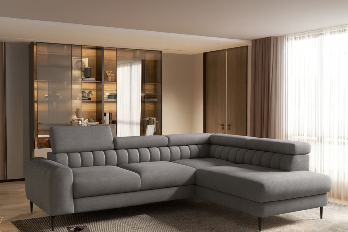 Sedacia súprava NAVAS L zaujme na prvý pohľad svojím moderným vzhľadom a funkčnosťou. Je postavená na vysokých čiernych kovových nožičkách, ktoré jej dodávajú ľahkosť a zároveň uľahčujú upratovanie pod ňou. Vertikálne prešívaná chrbtová opierka dodáva celej súprave elegantný a sofistikovaný vzhľad. Komfort pri sedení zvyšujú nastaviteľné opierky hlavy, vďaka ktorým si jednoducho prispôsobíte polohu podľa svojich potrieb. Súprava je navyše rozkladacia, čo poskytuje pohodlný priestor na príležitostné spanie. Praktickosť dopĺňa úložný priestor ukrytý v otomane, ideálny na odkladanie prikrývok, vankúšov či iných doplnkov.