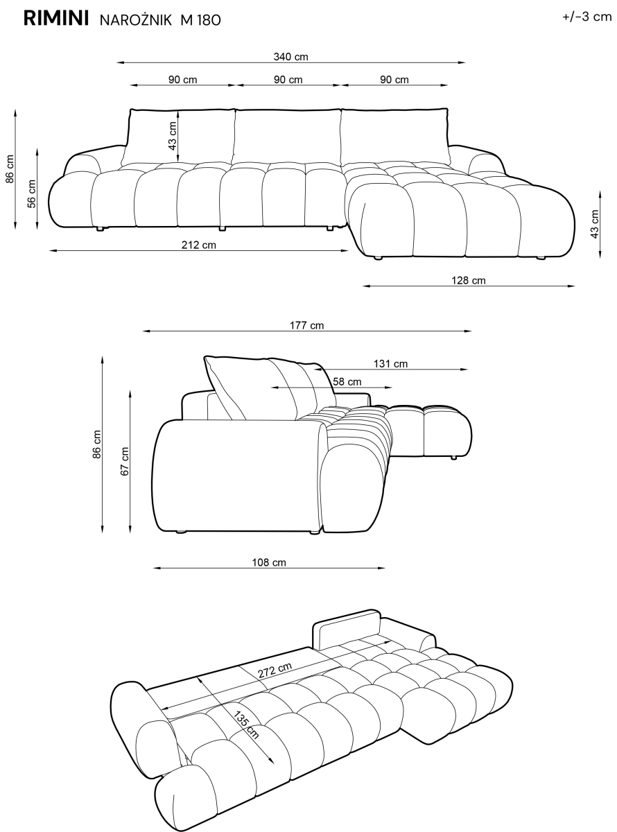Moderná a nadčasová rohová sedacia súprava RIMINI 180 spája dizajn, pohodlie a praktické funkcie v jednom elegantnom kúsku nábytku. Sedačka je s výrazným prešívaním do štvorcov pre atraktívny vzhľad a preto je ideálnou voľbou do moderných interiérov. Voľne ložené chrbtové vankúše umožňujú individuálne prispôsobenie – každý si ich môže upraviť podľa potreby, prípadne úplne odložiť pri rozklade alebo čistení. Rozkladací mechanizmus je intuitívny a nenáročný na obsluhu. Sedaciu časť stačí vysunúť smerom k sebe a následne chrbtovú opierku jednoducho preklopiť nadol. Týmto pohybom vznikne rovná a priestranná plocha na spanie, vhodná pre návštevy. Pod vysúvacou časťou sa nachádza praktický úložný priestor, do ktorého môžete jednoducho uložiť posteľnú bielizeň, deky, vankúše alebo sezónne veci. Úložný priestor je dobre prístupný a nezasahuje do vizuálu pohovky.