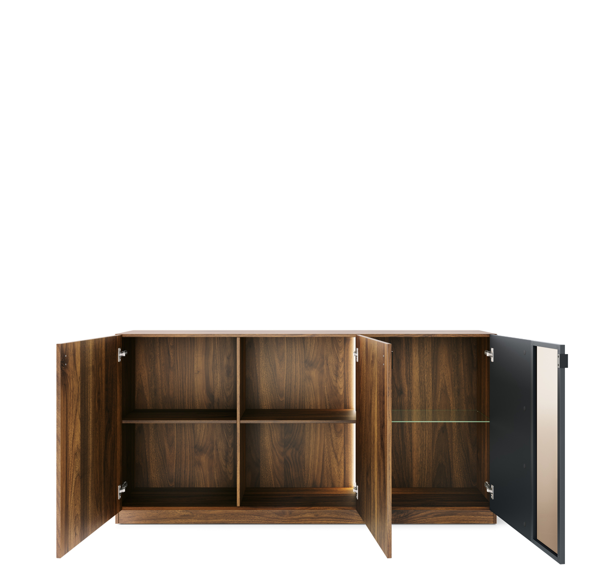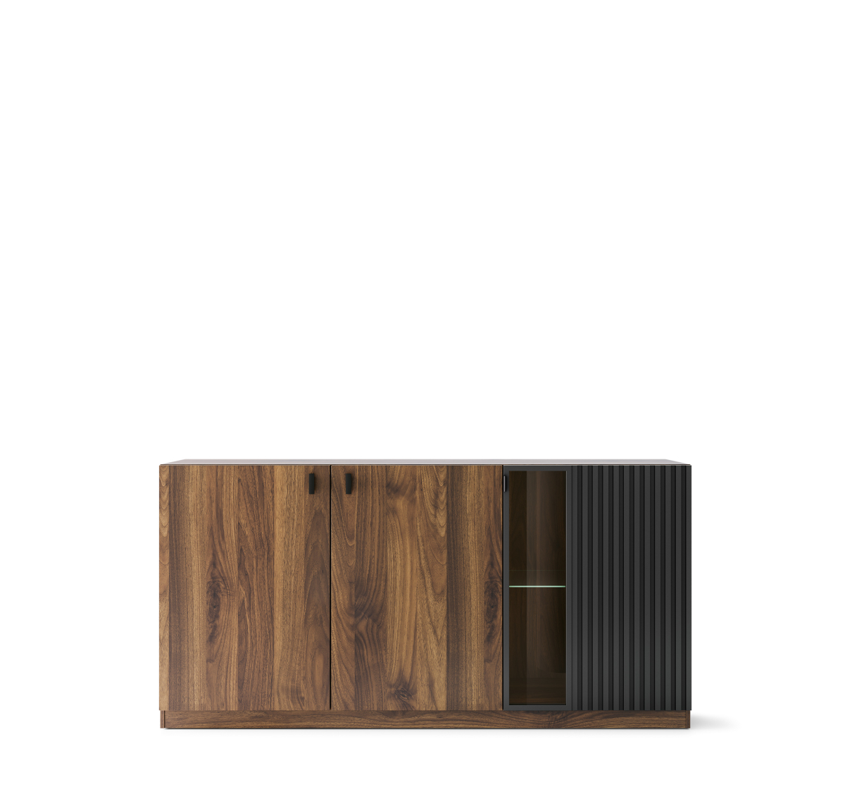 Sektorový nábytok RADIUM - komoda 3D č.45, predstavuje dokonalé spojenie moderného dizajnu, kvalitných materiálov a praktických riešení pre každodenné používanie. Elegantná kombinácia dekoru orech columbia a matnej čiernej farby vytvára nadčasový vzhľad, ktorý dokonale zapadne do moderných aj minimalistických interiérov. Vďaka modulárnemu riešeniu si môžete zostavu prispôsobiť presne podľa svojich potrieb a priestoru. RADIUM ponúka dostatok úložného priestoru pre elektroniku, knihy, dekorácie aj každodenné drobnosti. Obývačkový sektor RADIUM orech columbia – čierna je prémiový sektorový nábytok do obývačky, ktorý spája štýl, funkčnosť a komfort. Vďaka LED osvetleniu, tichému zatváraniu a precíznemu spracovaniu sa stane dominantou vášho interiéru. Integrované LED osvetlenie zarátané v cene, dodáva nábytku luxusný vzhľad a zároveň vytvára príjemnú svetelnú atmosféru v obývačke. Osvetlené vitríny a police zvýraznia dekorácie, knihy či dizajnové doplnky.
