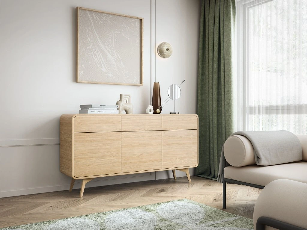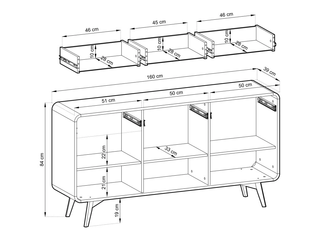 Komoda Helion K160 je vyrobená z kvalitnej laminovanej dosky hrúbky 16 mm s ABS hranami, ktoré zvyšujú odolnosť proti poškodeniu. Štíhle vysoké nožičky a zaoblené rohy korpusu dodávajú komode ľahkosť a mladistvý charakter, zatiaľ čo systém push-to-open zabezpečuje elegantný a čistý vzhľad.