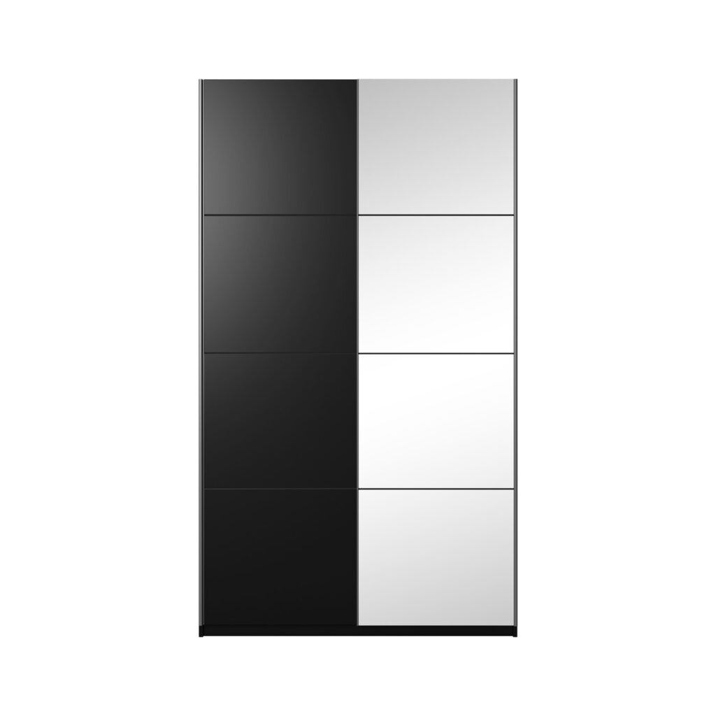 skrine BETA je počiarknutý čiernou farbou so zrkadlami. Potrebujete mať svoje veci uložené prehľadne a nemáte dostatok úložného priestoru? Ten vám zabezpečí množstvo políc a tyč na zavesenie, tak aby ste si mohli vytvoriť šatník podľa vlastnej predstavy. Rámy na dverách, ako aj vodiace lišty sú kovové.
