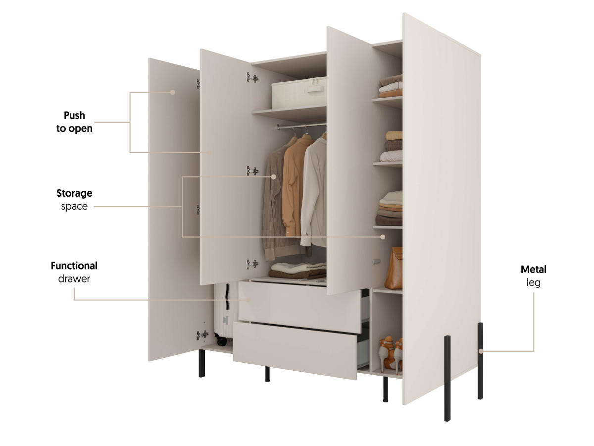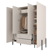 Sektorová spálňa JUKON - skriňa 24KSND20 - moderný spálňový nábytkový sektor v nadčasovom dizajne, trendovom farebnom prevedení kašmír, na vysokých / 19,5 cm / čiernych kovových nožičkách. Spálňa JUKON prinesie do interiéru vašej spálne eleganciu, atmosféru harmónie a tepla. Trendový kašmírový odtieň v kombinácii so štíhlymi čiernymi nohami vytvára jemný kontrast, ktorý prinesie do interiéru vašej spálne vizuálnu ľahkosť a vzdušnosť. Materál z ktorého je nábytok vyrobený je laminovaná certifikovaná drevotrieska v hrúbkach 15, 22 mm. Úchytky nie sú, na otváranie slúži systém STLAČ A OTVOR.