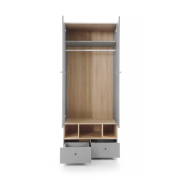 Vnútorné vybavenie skrine je premyslené pre maximálnu funkčnosť: obsahuje priestranné police na usporiadanie oblečenia či školských potrieb, praktické zásuvky na menšie doplnky a osobné veci a odkladací priestor s tyčou na zavesenie košieľ, blúz alebo kabátov. Toto rozloženie umožňuje efektívne usporiadať všetko od oblečenia po knihy a drobnosti, pričom každá vec má svoje miesto.
