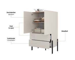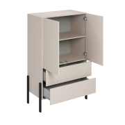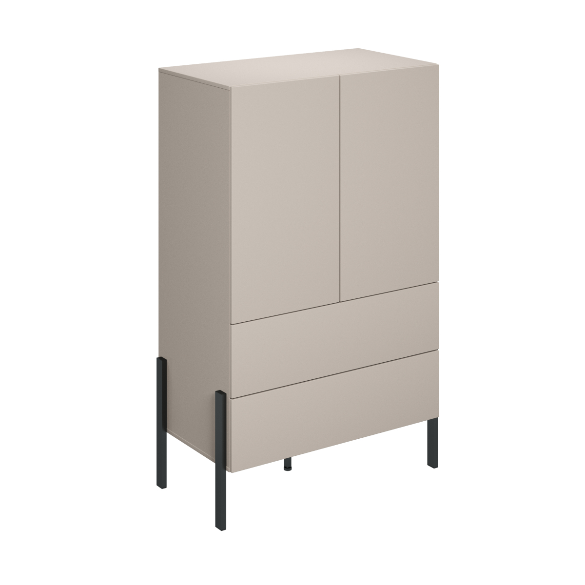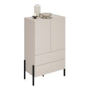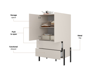 Sektorová spálňa JUKON - skrinka 24KSND38 - moderný spálňový nábytkový sektor v nadčasovom dizajne, trendovom farebnom prevedení kašmír, na vysokých / 19,5 cm / čiernych kovových nožičkách. Spálňa JUKON prinesie do interiéru vašej spálne eleganciu, atmosféru harmónie a tepla. Trendový kašmírový odtieň v kombinácii so štíhlymi čiernymi nohami vytvára jemný kontrast, ktorý prinesie do interiéru vašej spálne vizuálnu ľahkosť a vzdušnosť. Materál z ktorého je nábytok vyrobený je laminovaná certifikovaná drevotrieska v hrúbkach 15, 22 mm. Úchytky nie sú, na otváranie slúži systém STLAČ A OTVOR.