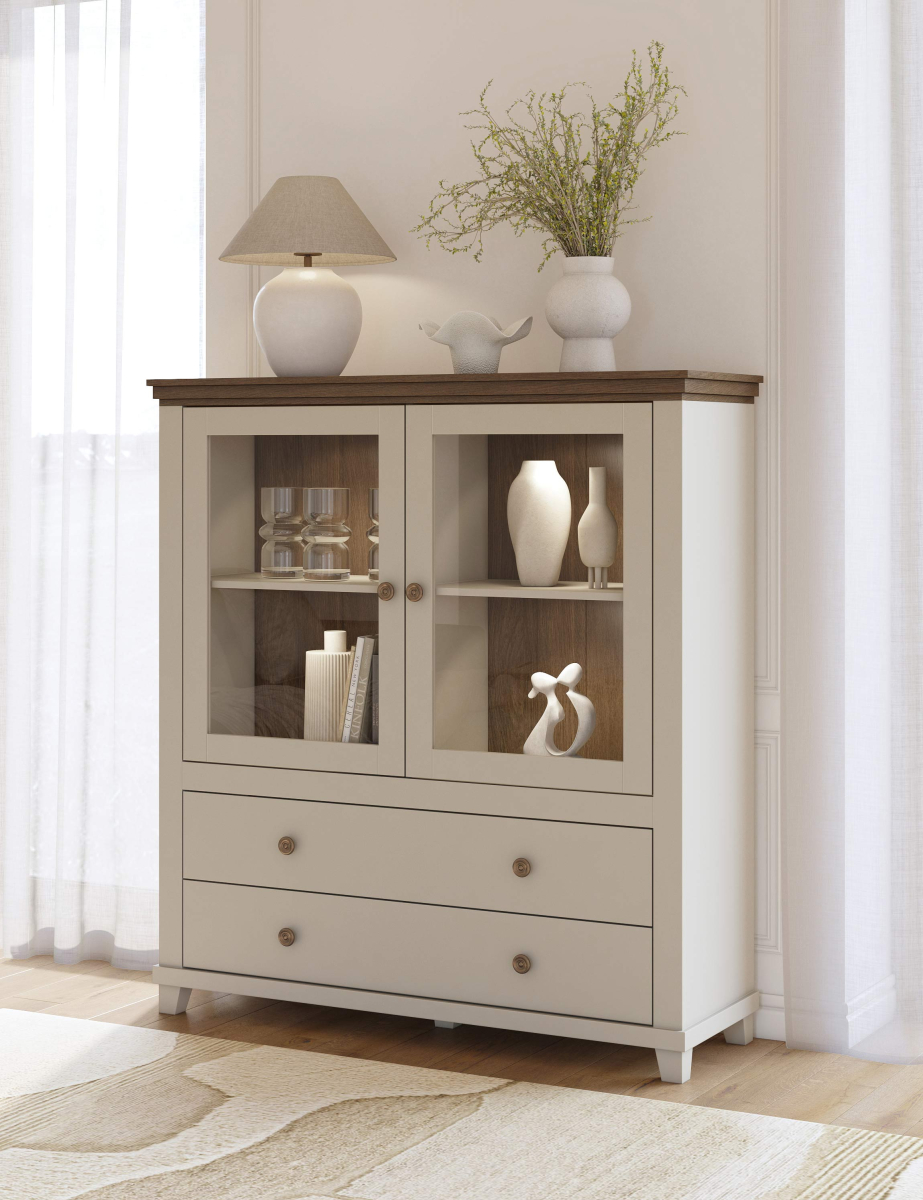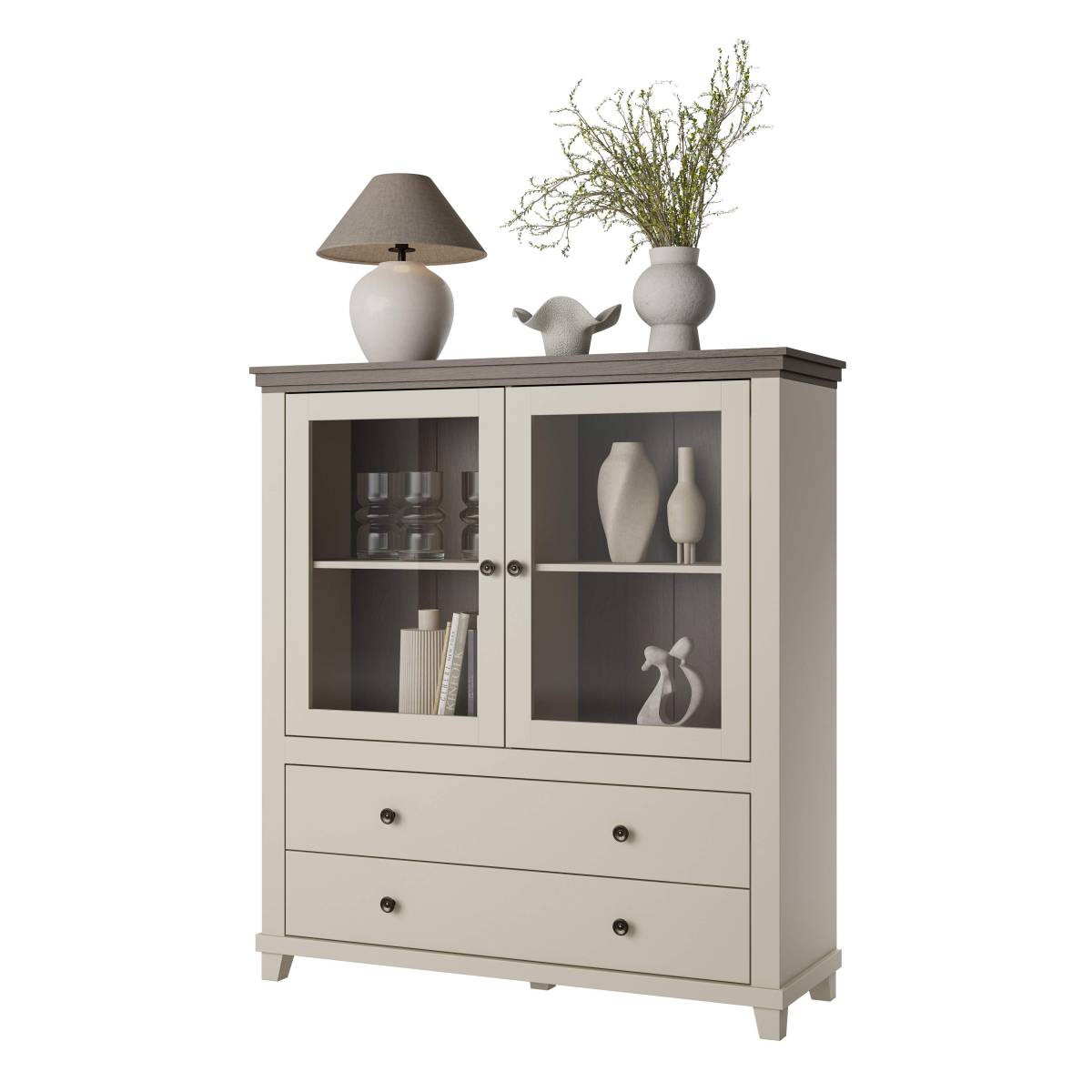 EVORA sektorový nábytok - vitrína nízka 24D1JU46 od firmy HELVETIA. Krásne farebné prevedenie bežová - bežová / dub dunin je výsledkom najnovších trendov bytových dizajnérov. Čo sa týka štýlu je možné nábytok EVORA zaradiť do modernejšej verzie klasického dizajnu, je vhodný do obývacej izby alebo jedálne. Korpusy sú vyrobené z laminovanej DTD, dvierka a vrchné vence sú potiahnuté fóliou. Nožičky sú vyrobené z MDF a potiahnuté fóliou. Použité kvalitné pánty a kovové úchytky. Nábytok EVORA má výbornú kvalitu prevedenia, zabalený je demont v kartónoch. Možnosť doobjednať LED osvetlenie.